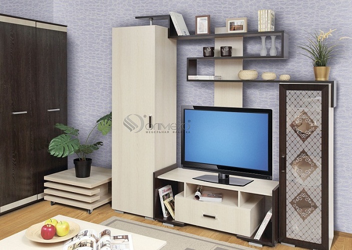 Комплектация: тумба для ТВ, полки, комод, шкаф комбинированный.