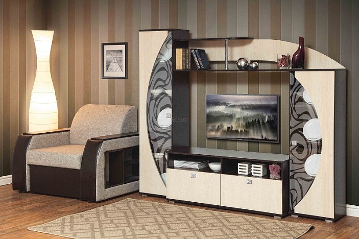 код 88038Современная стенка с элементами хай-тек. Фигурное остекление шкафов с рисунком.