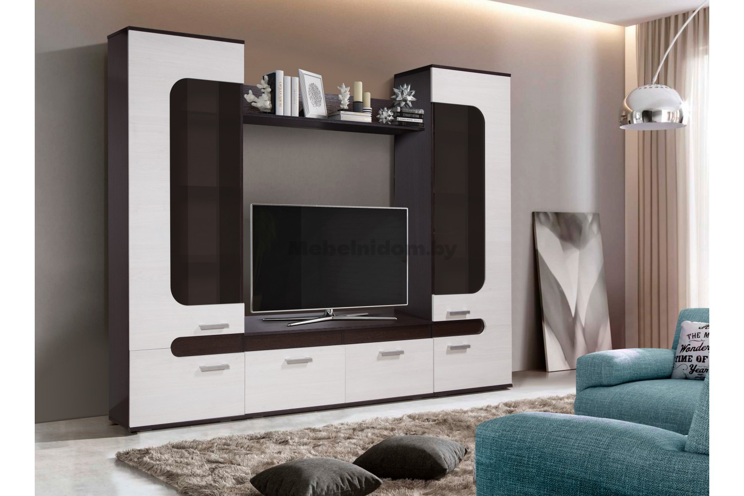 Комплект включает в себя тумбу для ТВ, тумбу с витриной, подвесной модуль и открытую полку.
