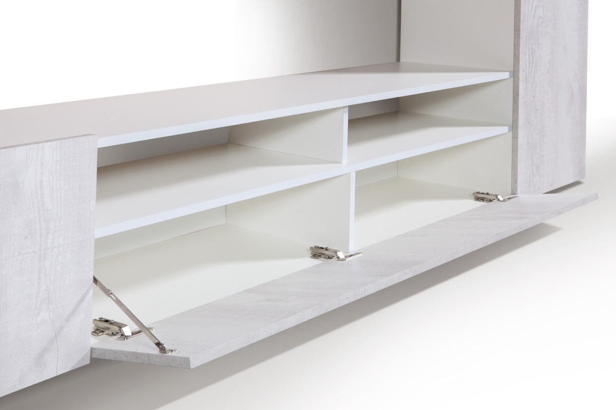 Размеры стенки (ширина 2130 мм) позволяют ей легко вписаться в любое пространство, обеспечивая достаточно места для хранения и размещения телевизора и других аксессуаров. Бетонно-серый оттенок с легким древесным текстурным эффектом придает стенке универсальность, гармонично сочетаясь с различными стилями интерьера — от современного до индустриального.