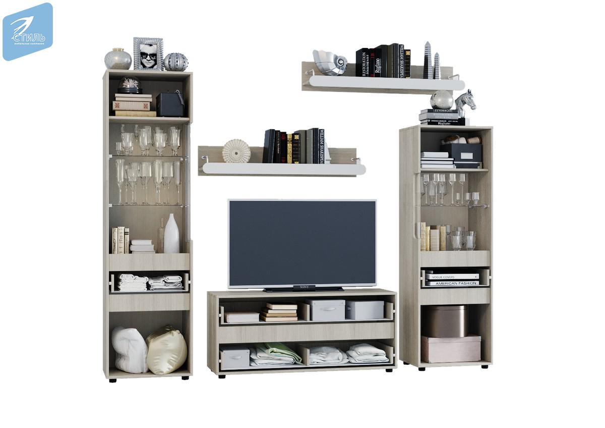 В комплекте: пенал со стеклом, шкаф платяной, полка закрытая, тумба ТВ.
