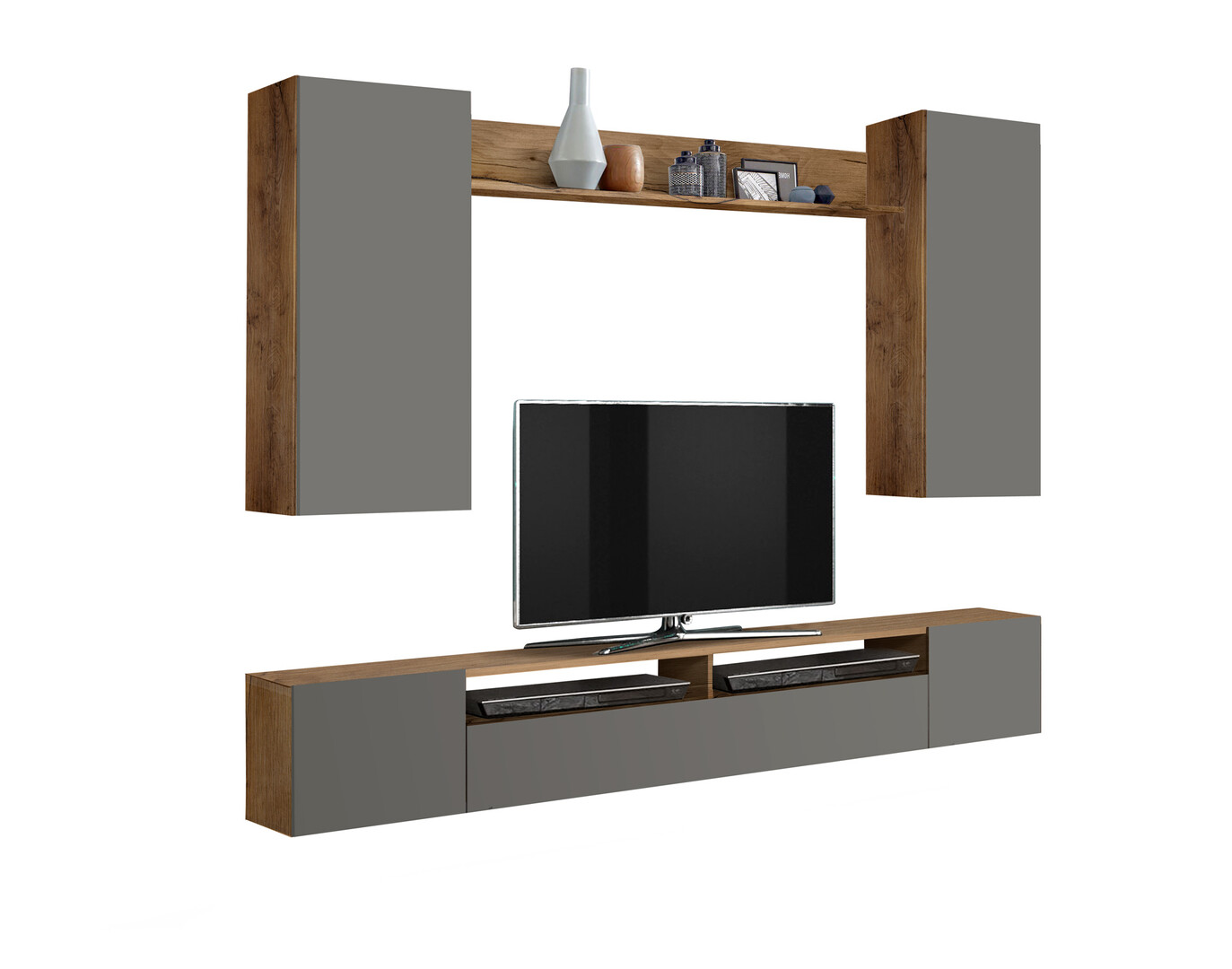 В комплект входит два вместительных шкафа, тумба ТВ, витрины и полки.