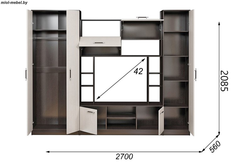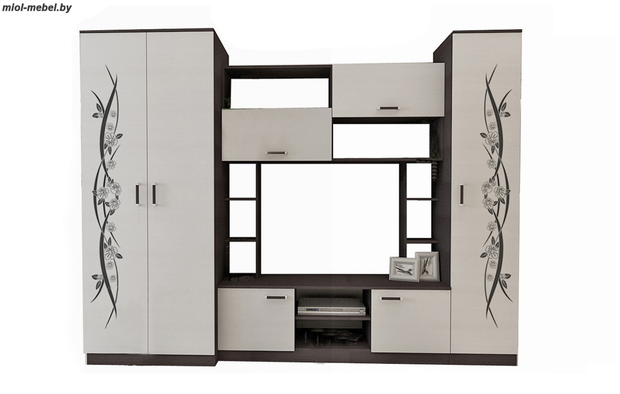 код 107215Современная и вместительная модель. Открытые полки, ниша для ТВ, шкаф, пенал. Материал: ЛДСП.