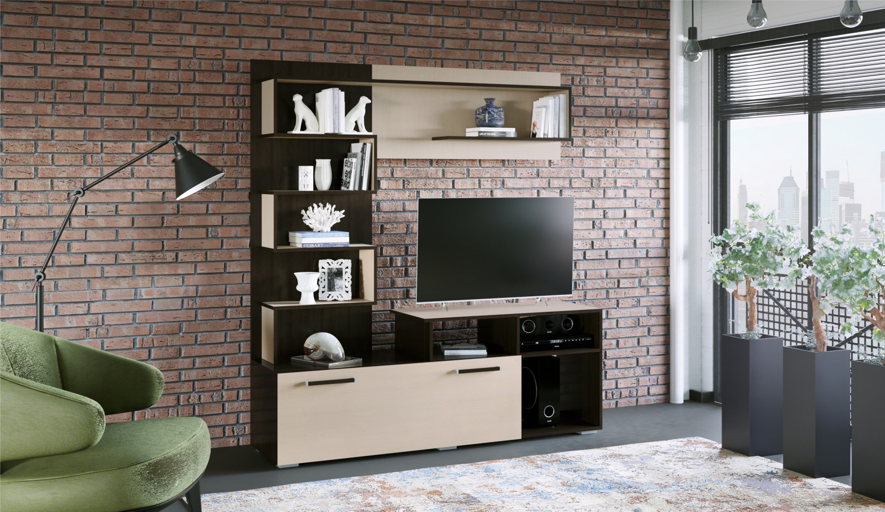 Компактная, ассиметричная стенка для размещения в гостиной. Благодаря универсальному цветовому решению и эргономичным размерам подойдет практически к любому интерьеру. В нижней части расположены вместительные ящики с распашными дверцами.