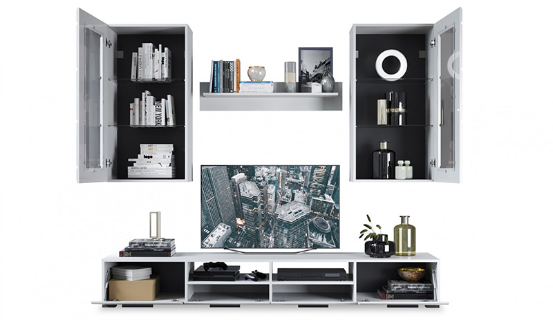 Стенка в стиле минимализм с фасадами однотонного белого цвета.