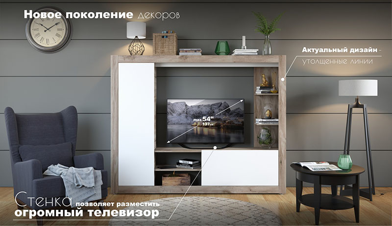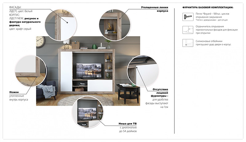 - TV-ниша (ШхВ): 120х98 см (max TV 54″).