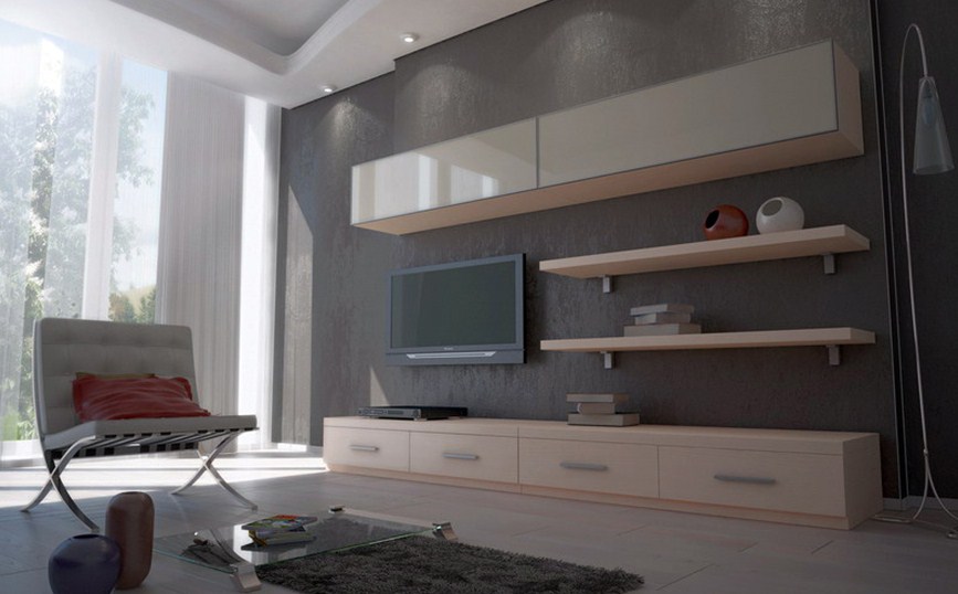 Стенка со спокойным оттенком фасадов навесной части конструкции оживит интерьер в современном стиле. Гарнитур состоит из двух сплошных длинных модулей в комбинации с подвесными полками. Подставка под ТВ выполнена в бежевом цвете, что делает внешний вид изделия гармоничным и ненавязчивым. Модель оснащена двумя стандартными полками, на которых удобно разместить книги либо сувениры.