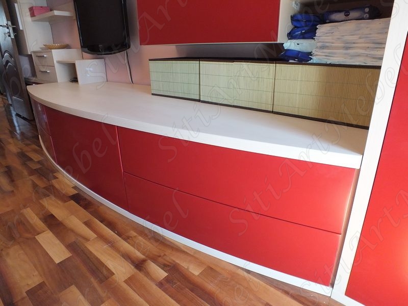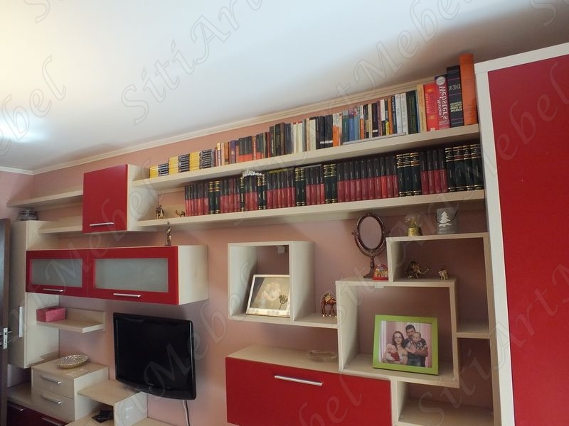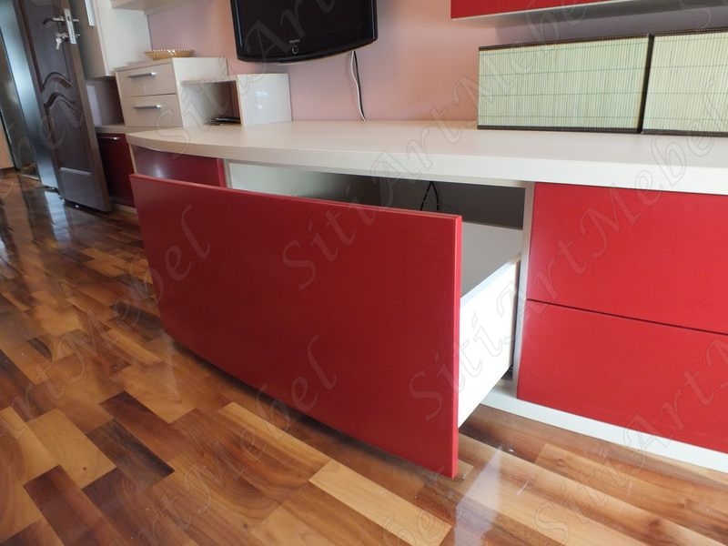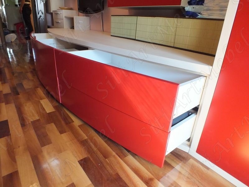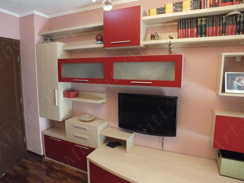 Стильная современная стенка будет превосходно смотреться в просторной светлой комнате. Конструкция продумана до самых мелочей. В составе модели: удлиненные открытые полки и ниши, выдвижные ящики и распашные полки, часть из которых украшают светлые вставки лакомат. Большую функциональность стенка приобретает за счет вместительного шкафа с металлическими ручками. Ярко-красный фасад позволит модели стать основным элементом совершенно любого интерьера.
