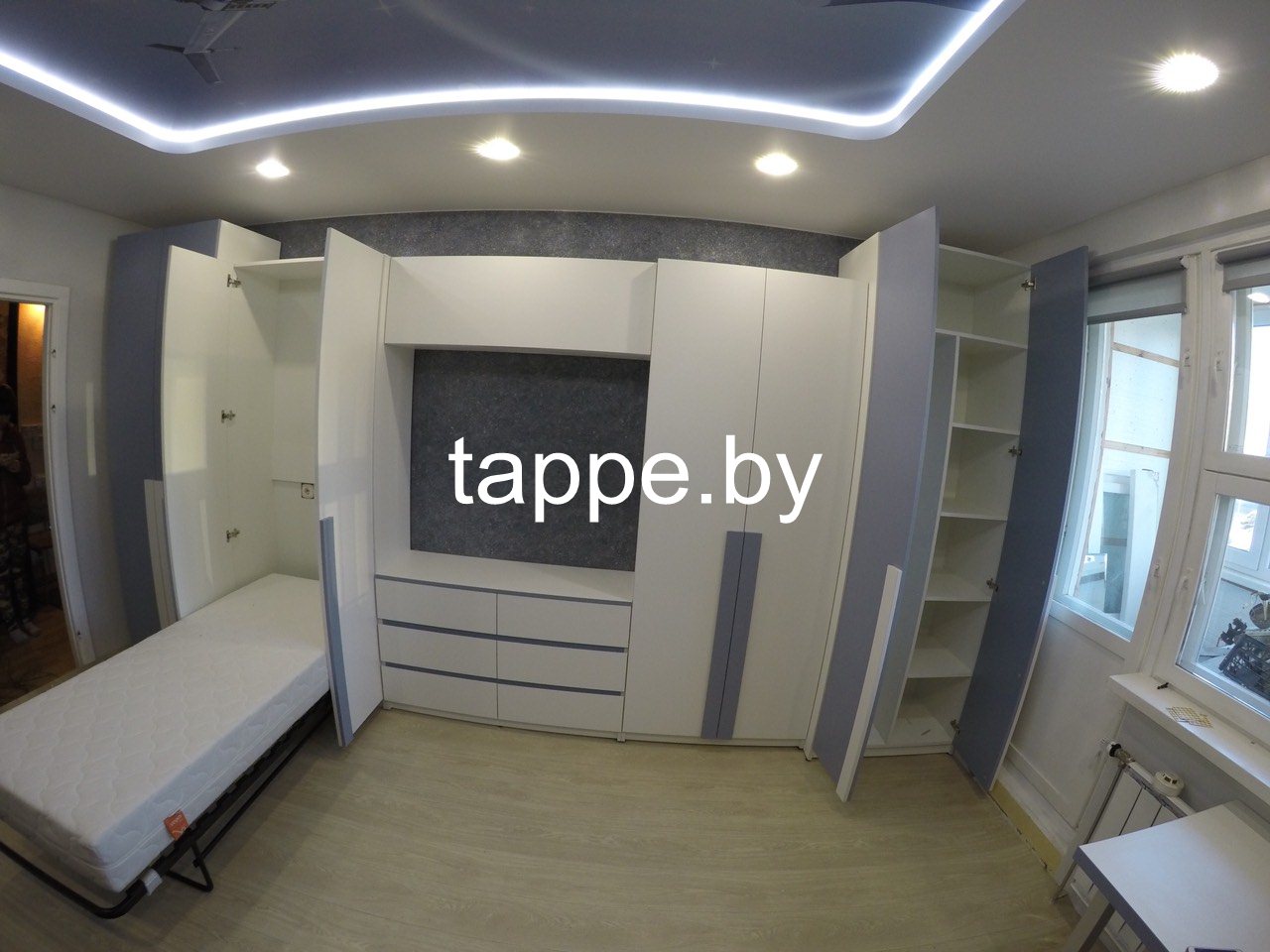 Функциональная модель с двухстворчатым шкафом-купе, выдвижными ящиками и полками.