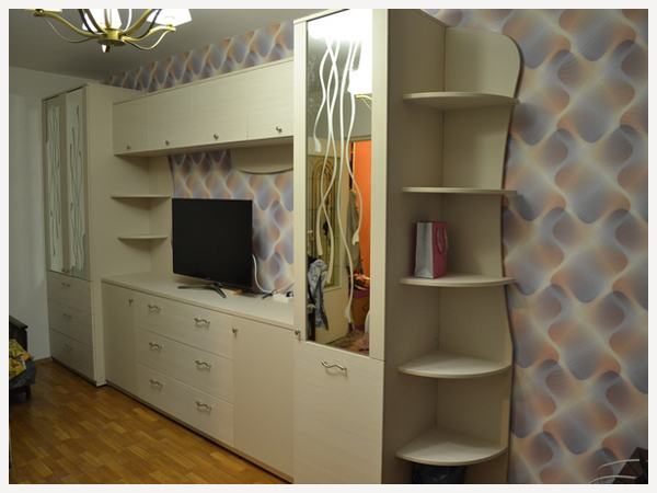 Вместительная система хранения, наличие тумбы для ТВ, открытых полок и шкафчиков.