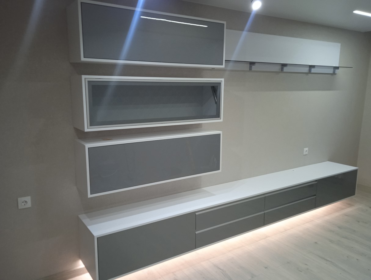 Современная модель с декорированным стеклом. Вместительные фасады. Ниша для ТВ.
