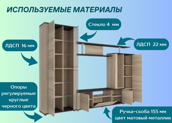 Но так же отличительная черта Соло 10А - дизайн. Сочетание светлого оттенка молочного дуба, и контрастности венге позволяет выигрышно смотреться во многих архитектурных стилях. Вставки из стекла встроенные в гостиную, а именно дверцы и полки, делают гостиную более невесомой и светлой, что позволит сделать комнату визуально больше.