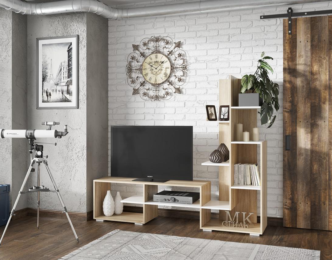 код 116563Тумба под ТВ размером 120х90 см с множеством открытых полок.