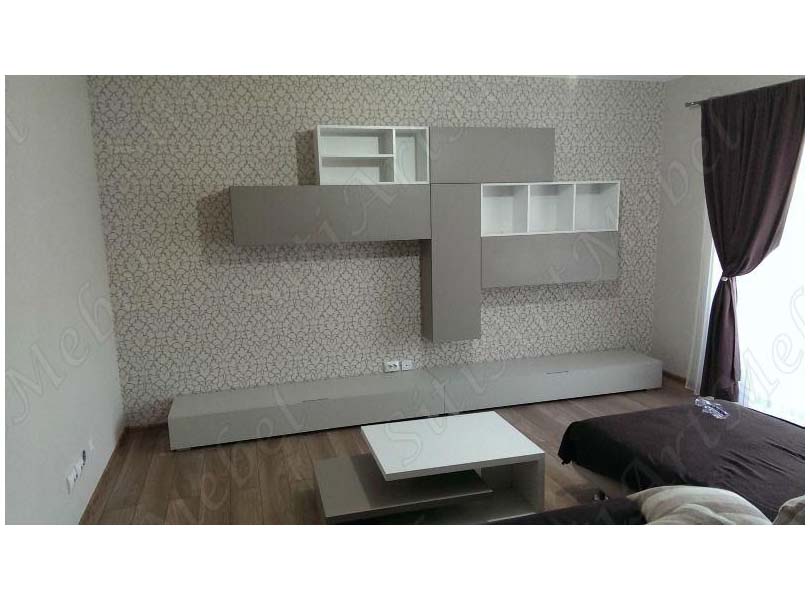 Стенка с серым фасадом представлена в виде стильной современной конструкции. Модель состоит из открытых полочек для различных предметов и закрытых тумбочек с распашными створками. Предусмотрена также ниша для телевизора с большой диагональю.