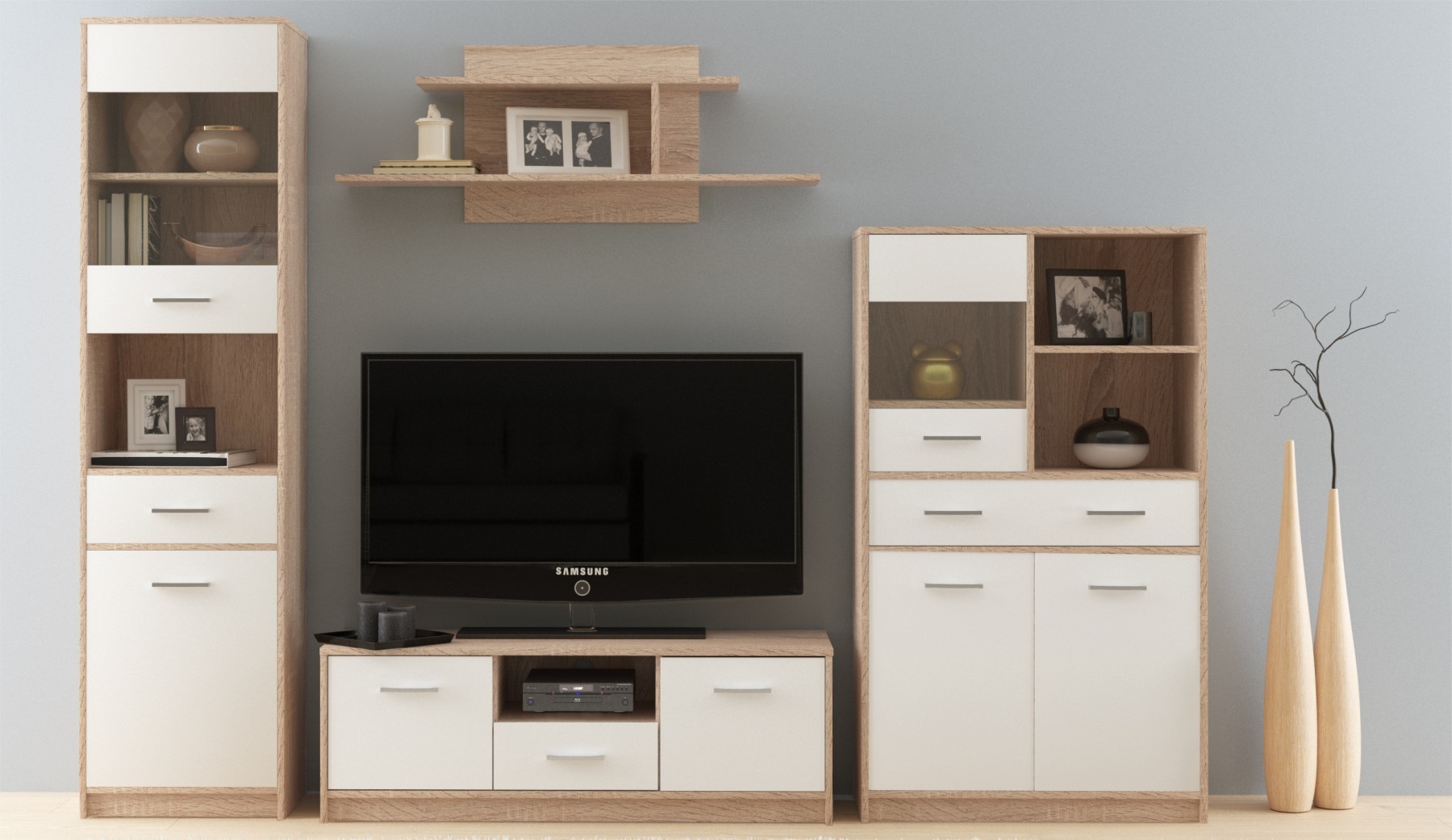 Контрастное сочетание цветов. Подвесная тумба для ТВ, витрина и два пенала.