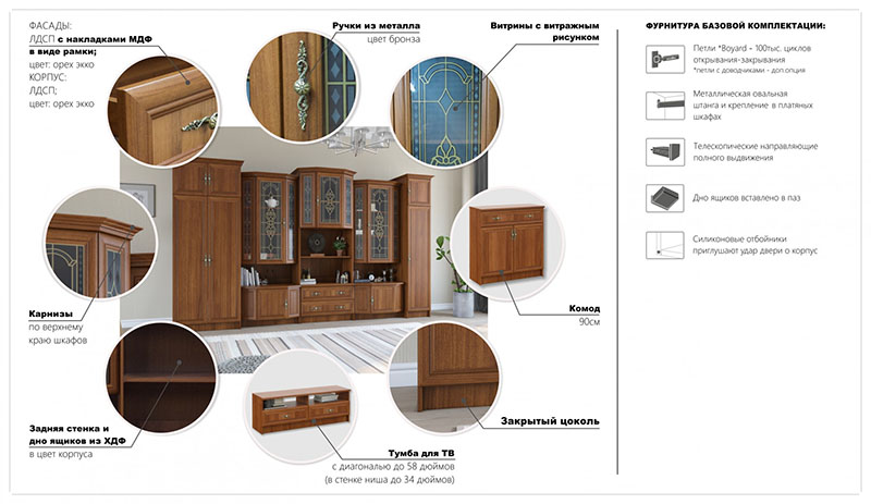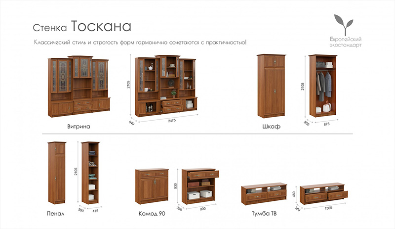 Стенку можно дополнить другими модулями из коллекции «Тоскана», смотрите фото 2 в галерее.