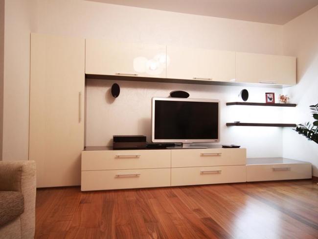 Стенка в гостиную с молочными глянцевыми фасадами