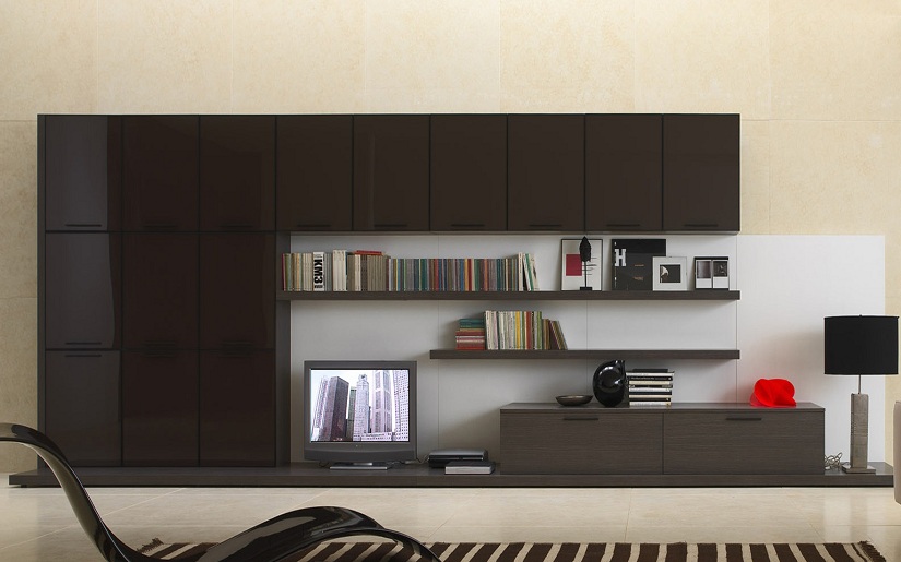 Прямоугольная стенка в гостиную комнату отличается стильным и современным дизайном. Фасады окрашены в глянец кофейного цвета. Широкая тумба-подставка под ТВ представлена в цвете венге темный.