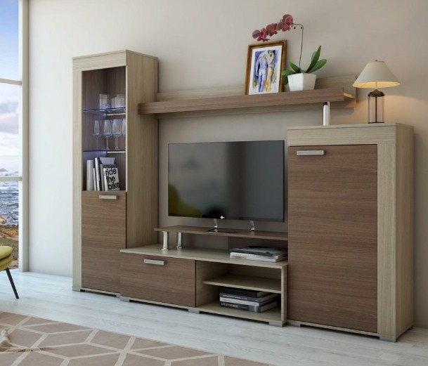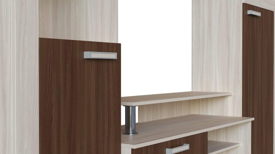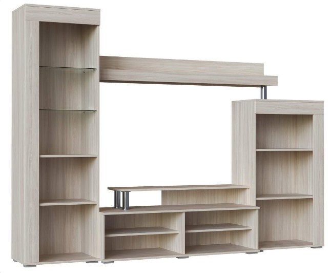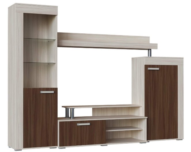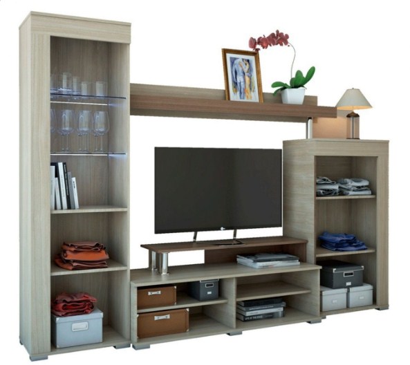 Стенка сочетает в себе компактность и функциональность. Светлый дизайн.