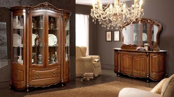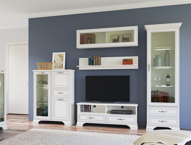 Стенка в гостиную «Тиффани» выполнена в светлом сочетании цветов. Стенка имеет модульную конструкцию со свободным расположением составляющих элементов. Конструкция выполнена в классическом стиле с высокими стеклянными вставками на фасаде. Набор корпусной мебели"Тиффани" от белорусской мебельной фабрики АНРЭКС классика в современном исполнении. Красивая белая горка для гостиной с рамочными фасадами с патиной станет прекрасным интерьерным решением при меблировке квартиры. В наборе предусмотрено все самое необходимое: застекленный шкаф и тумба с витриной из стекла для посуды, книг, столового белья, тумба под телевизор и две навесные полки. Благодаря мобильности и всегда удачному сочетанию модулей друг с другом, есть возможность разместить их так, как будет удобно, создав тем самым неповторимый интерьер.