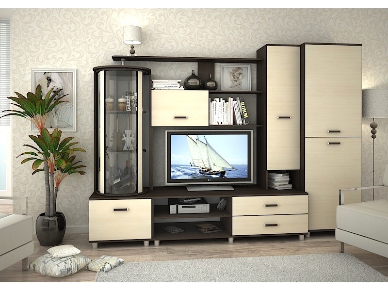 Комплектация - шкаф распашной, пенал, центральная часть с полками и ТВ нишей, зеркало.