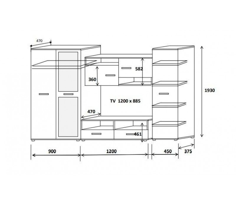 код 121836Стенка в зал с зеркалами на дверце шкафа. Контрастные горизонтальные ручки.