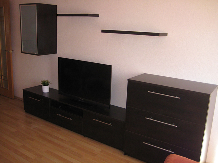 Стенка, выполненная в современном стиле, представлена в темном тоне. В комплекте представлено несколько полок открытого типа, подвесной шкафчик со светлой створкой, комод с выдвижными ящиками и тумбочка под ТВ. Имеется также открытая ниша для аудио или видеотехники.
