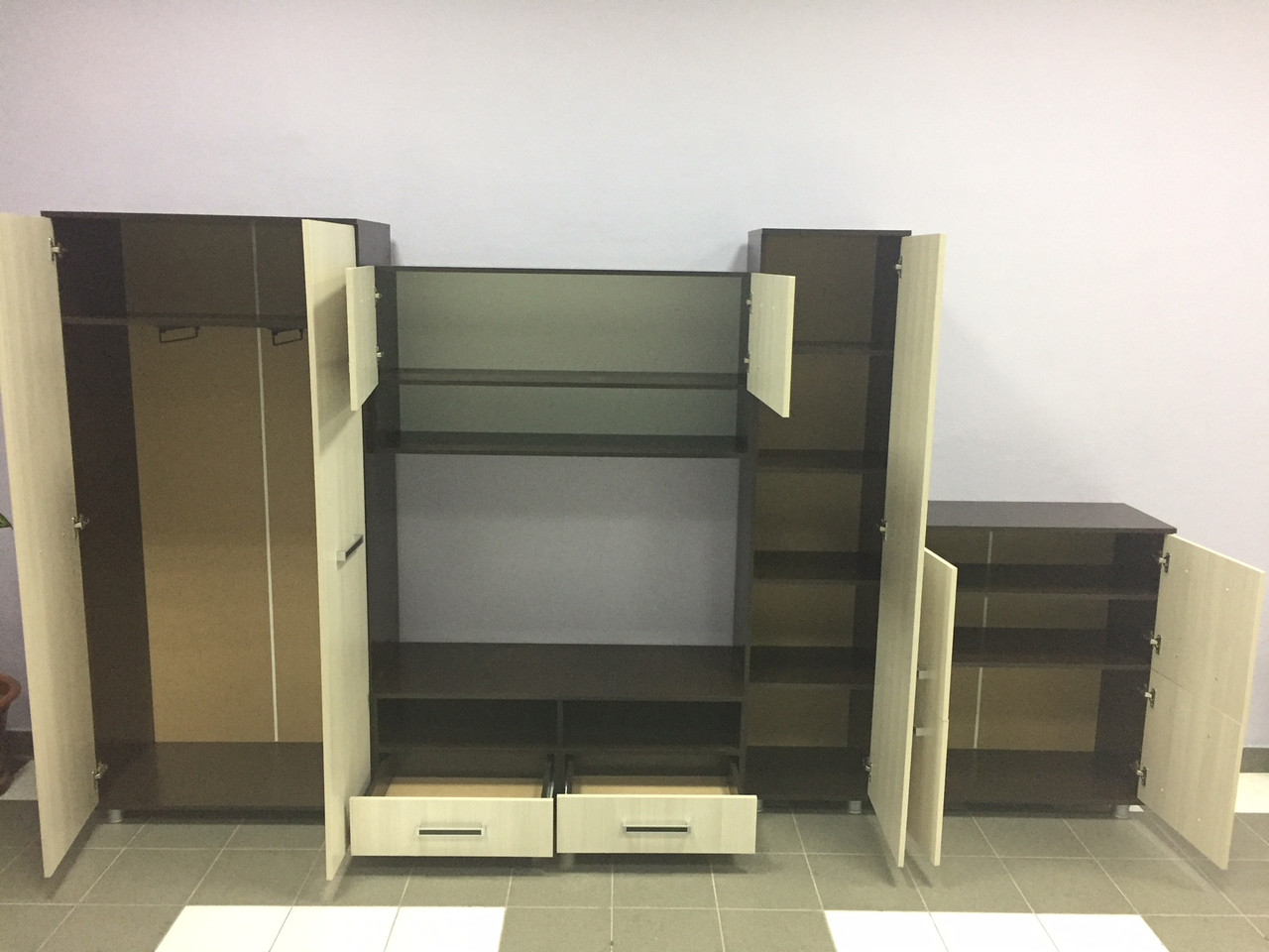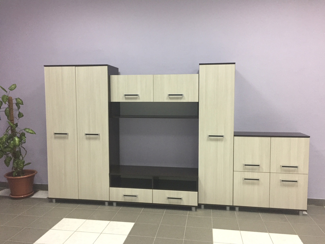 Функциональная и вместительная стенка в гостиную. 2 шкафа-купе, комод, полка, навесная тумба.