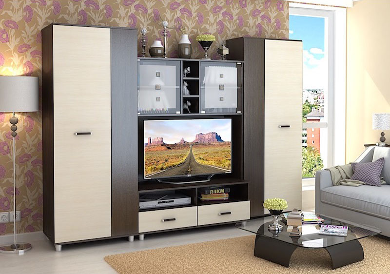 Стенка в бежево-коричневых оттенках. Материал: ЛДСП.