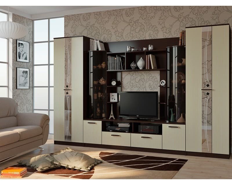 В состав комплекта входит: шкаф с витриной, шкаф с витриной, тумба, полка навесная.