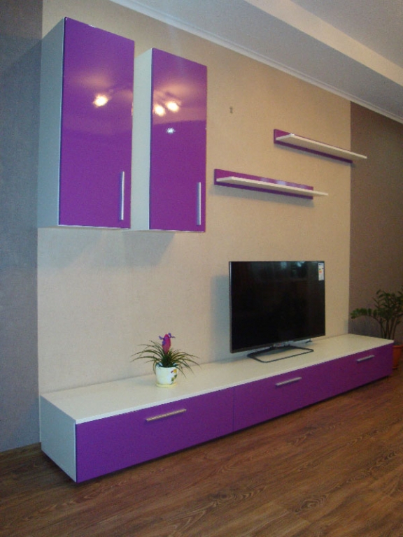 Очень яркая горка цвета фуксии станет прекрасным цветовым акцентом в пространстве гостиной или спальной комнаты и разбавит основной тон интерьера. Навесные элементы этого модульного набора позволяют варьировать их расположение на стенах. Благодаря вариациям такой компоновки, горка визуально приобретает меньшие или большие размеры для максимально лаконичного расположения в габаритах вашей комнаты.