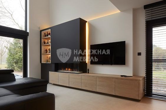 Тумба с шестью ящиками, открытые ниши с подсветкой, ниша под электрический камин.