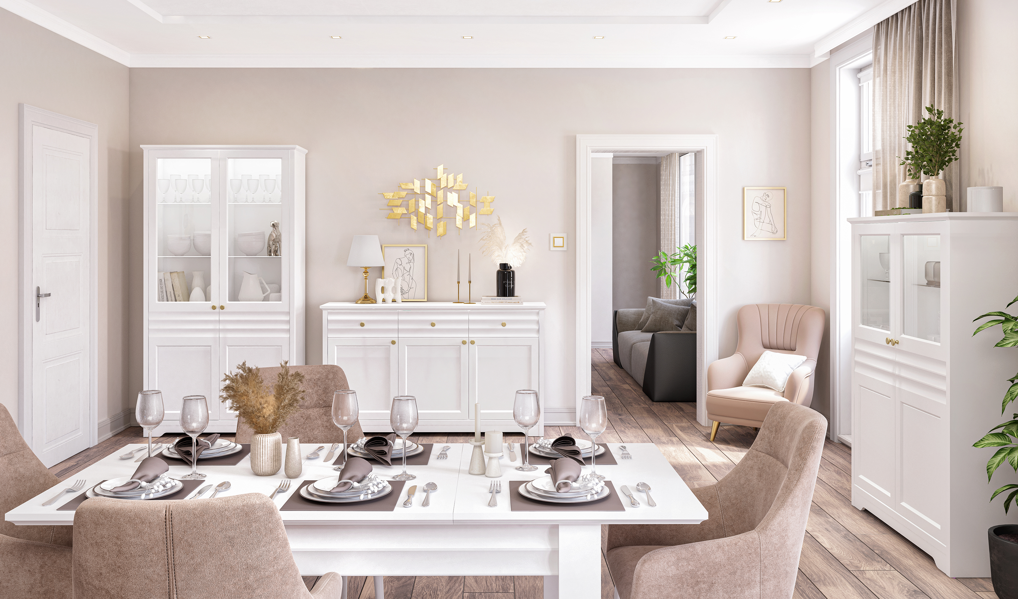 Денвер – это коллекция корпусной мебели для спальни, гостиной и столовой. Прямые строгие линии в сочетании с легкой горизонтальной волной на фасадах придают мебели элегантный и уверенный вид. Белый матовый цвет мебели, любимый многими за универсальность, можно сочетать с любым оттенком стен и пола. Округлые металлические золотые ручки разбавляют строгий и лаконичный вид фасадов и добавляют интерьеру утонченности. Одно из преимуществ дизайна коллекции Денвер – возможность выбрать для оформления комнаты, как комплект мебели, так и отдельные модули, которые впишутся в интерьер практически в любом стиле.