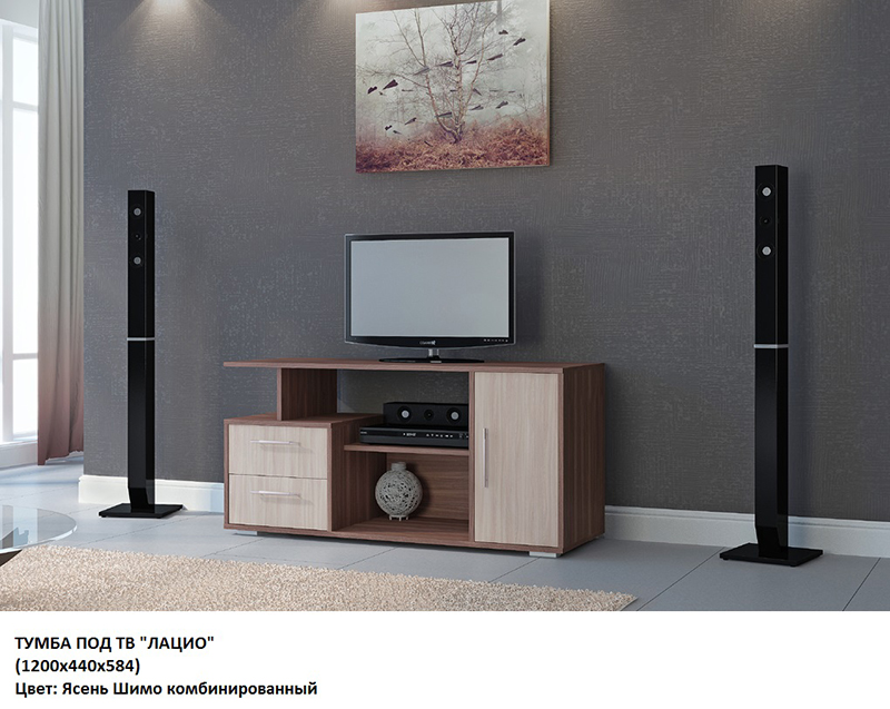 Тумба «Лацио» объединяет в себе стильный дизайн и невероятную практичность. Система хранения представлена несколькими выдвижными ящиками и распашной тумбочкой. Открытые полочки позволят расставить различные предметы декора, а столешница предназначена для установки большого ТВ.