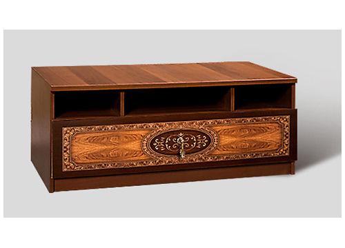 Тумба под ТВ «Карина-2» выполнена из качественных материалов. Фасад модели украшает оригинальный узор. В комплекте имеется несколько открытых ниш для установки дополнительной аудио- или видеотехники.