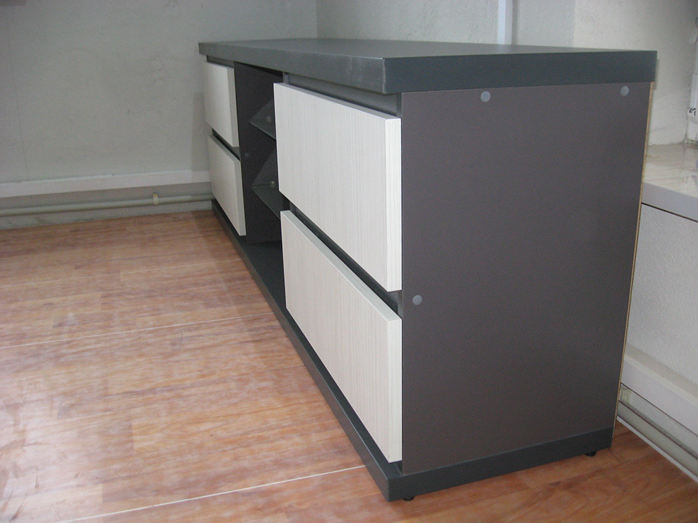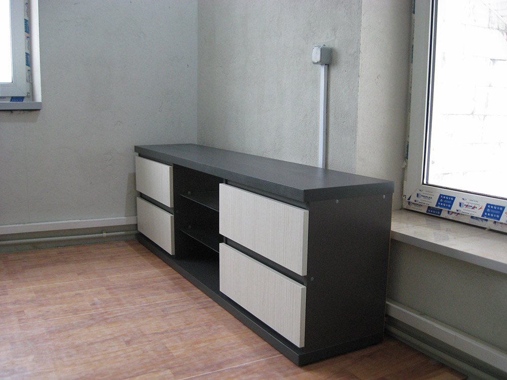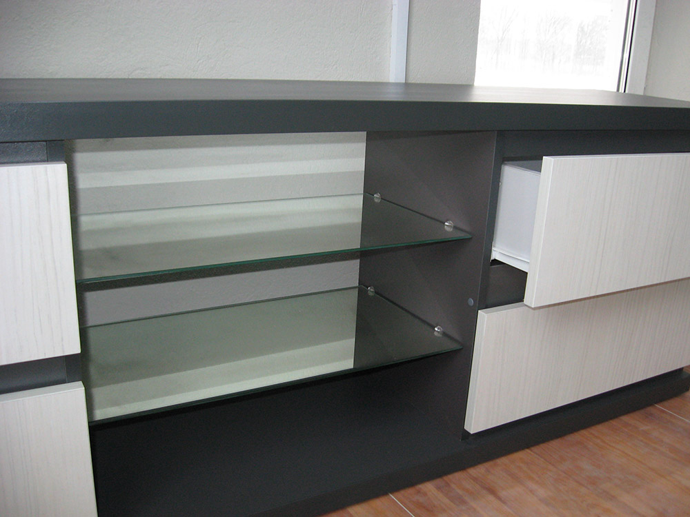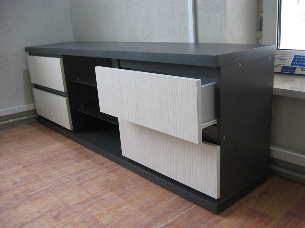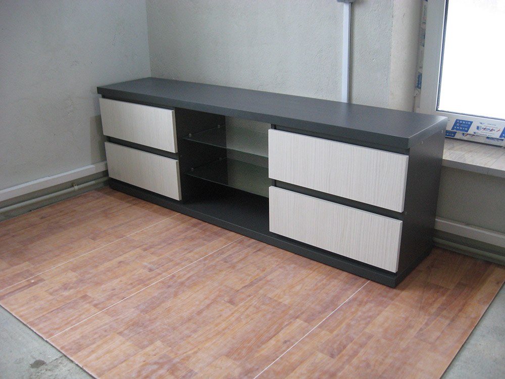 Широкая тумба под ТВ выполнена в корпусе цвета графита. Фасады конструкции исполнены в светлом оттенке. В центральной части модели расположены две стеклянные полочки для подключаемой к ТВ техники. Отсутствие задней стенки позволяет легко проложить различные провода. Фасады выдвижных ящиков не перегружены декоративными элементами или ручками, что придает тумбе современный внешний вид.