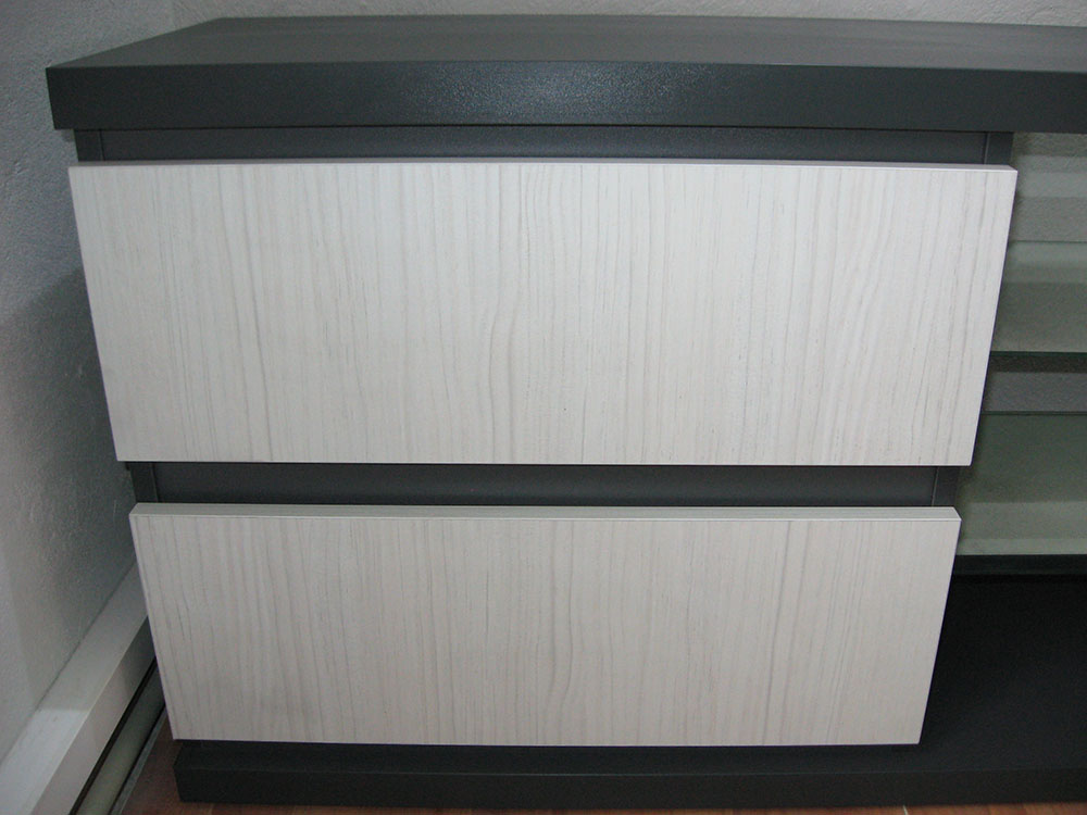 Современный дизайн с фрезеровкой. Створки открываются при помощи выступа фасада.