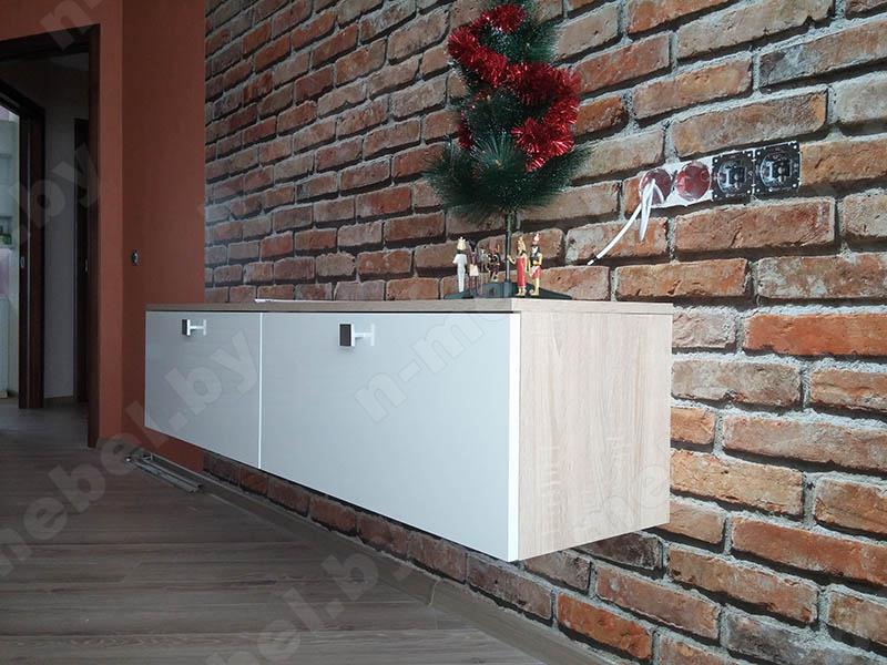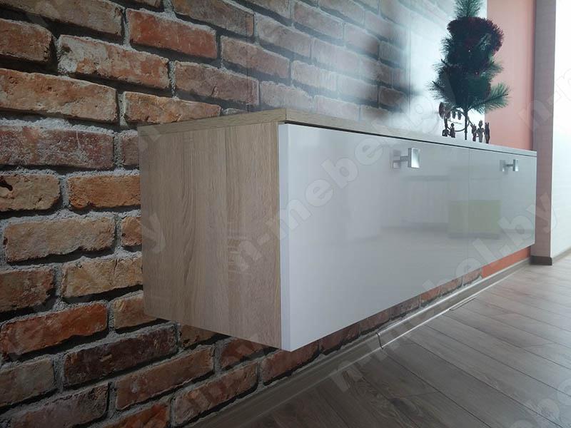 Современная тумба для ТВ представлена в виде стильной подвесной конструкции. Глянцевый фасад модели окрашен в белый цвет. Две створки оснащены миниатюрными ручками квадратной формы. Удлиненная столешница позволит установить не только телевизор с большой диагональю, но и расставить любые предметы декора, которые украсят вашу спальню или гостиную.