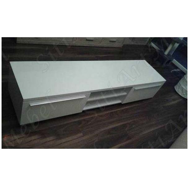 Современная тумбочка, окрашенная в белый цвет, отличной подойдет для гостиной, спальни или зала. Створки двух выдвижных ящиков оснащены удлиненными металлическими ручками. Также имеются две ниши для хранения видео- или аудиотехники.