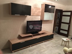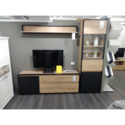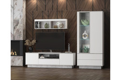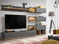 Вместительная система хранения, наличие тумбы для ТВ, открытых полок и шкафчиков.