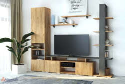 Модульная гостиная состоит из тумбы под телевизор, шкафа, стеллажа и двух навесных полок