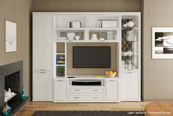 Модульный набор мебели с белыми глянцевыми фасадами в гостиную. Материал: МДФ покрытый плёнкой, ЛДСП.