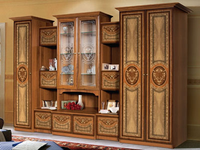 Симметричный фасад с филенками и частичным остеклением. Есть ниша для ТВ и аудио-аппаратуры.