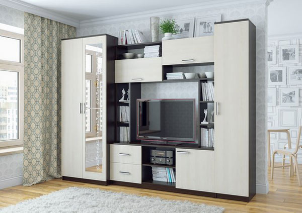Стенка в зал со светлыми фасадами и сферическим остеклением.