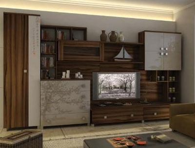 Современная стенка в темном минималистичном исполнении со вставкой каллиграфического принта.
