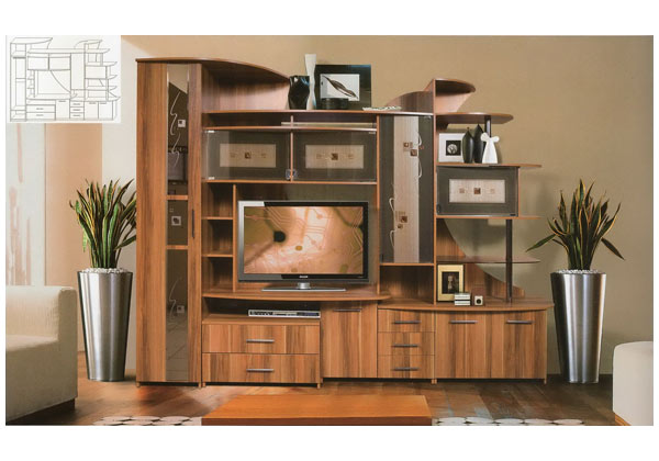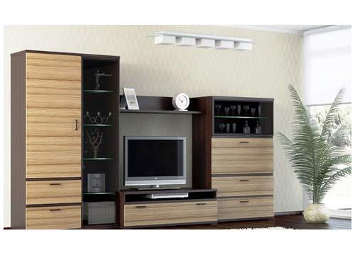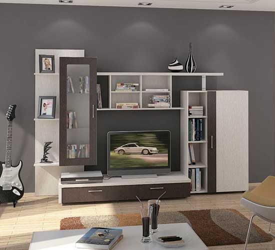 Широкая слегка рельефная стенка с витринами и длинными полками над нишей для ТВ.