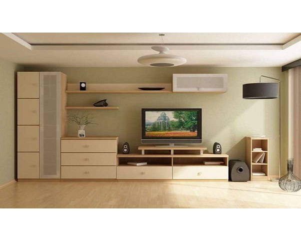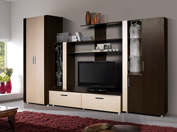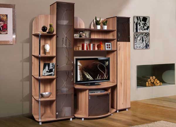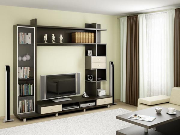 Несколько открытых полок, место для телевизора. Сочетание коричневого и бежевого.