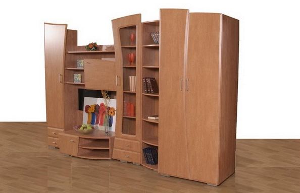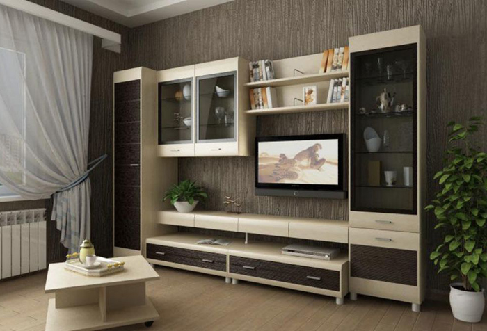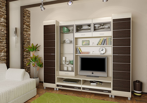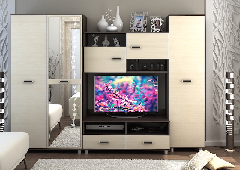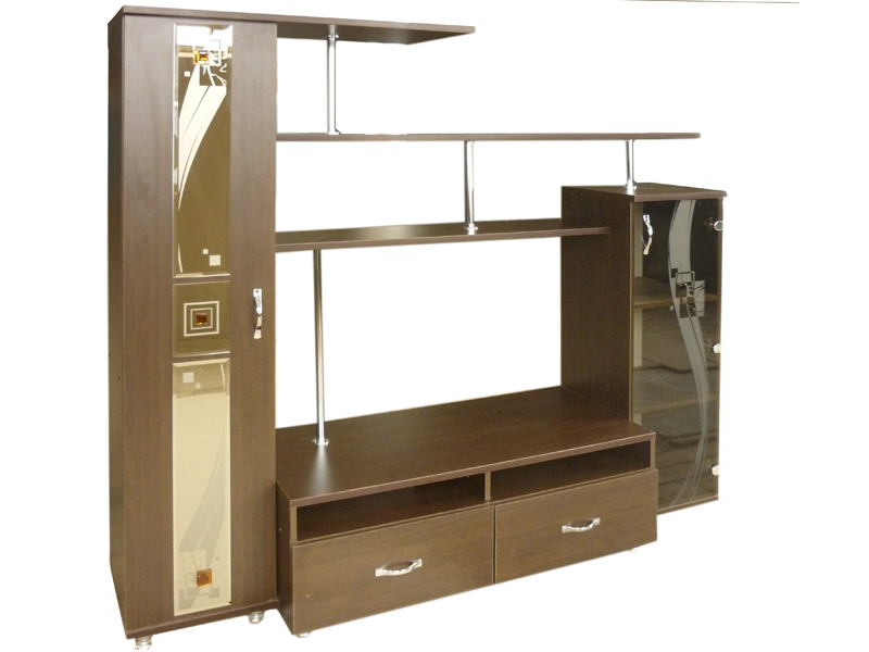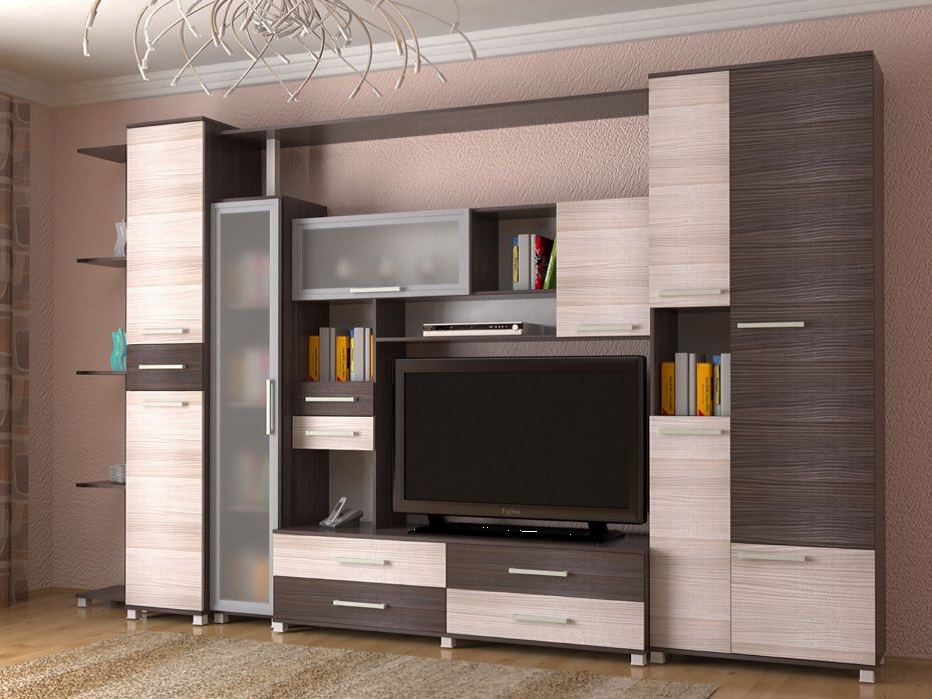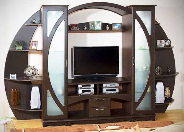 Специальная ниша для телевизора. Остекленные и закрытые полки.