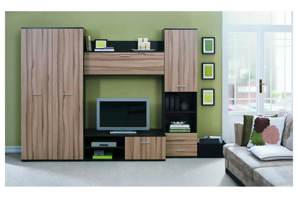 Симметричный фасад с филенками и частичным остеклением. Есть ниша для ТВ и аудио-аппаратуры.