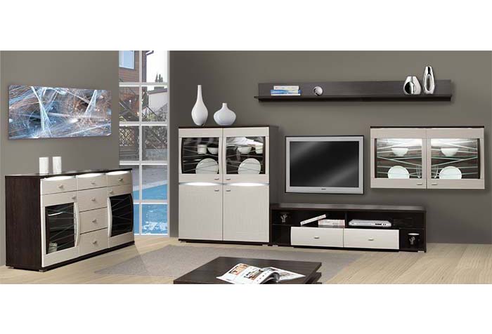 Стенка в строгой расцветке. Симметричный фасад с филенками и вставками стекла лакомат.
